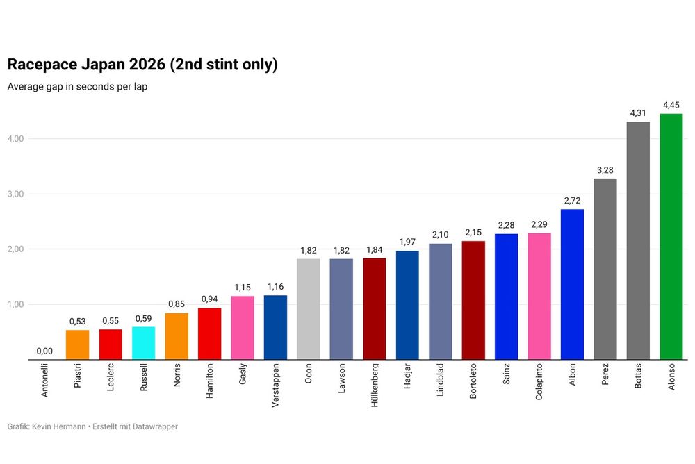 Mercedes’ superiority turned notably evident within the second stint. In clear air, Antonelli was on common round half a second per lap quicker than the competitors on comparable tyre age.